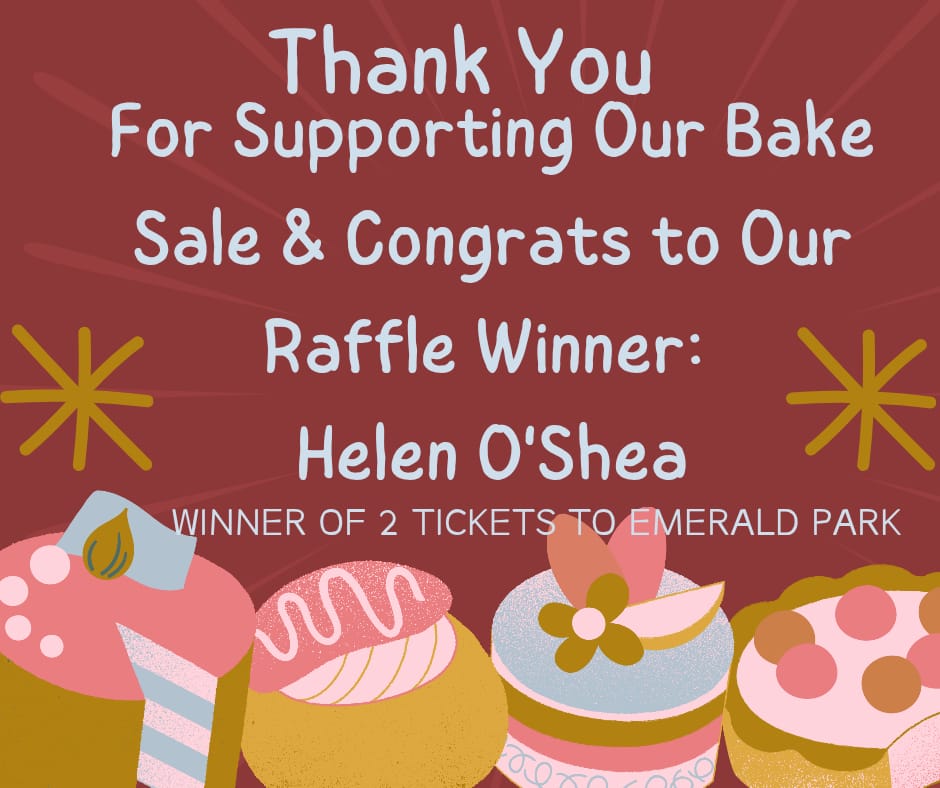 Our Youth Committee had a very successful bake sale once again this year following the success of the 2024 event. They held the sale alongside running a raffle for 2 Emerald Park Tickets. The lucky winner of the raffle was Helen OShea.